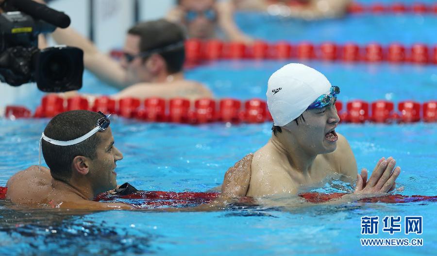 8月4日,中国选手孙杨(右)在获胜后难抑心中激动。当日,在2012伦敦奥运会男子1500米自由泳决赛中,中国选手孙杨以14分31秒02的成绩获得冠军,并打破世界纪录。新华社记者费茂华摄