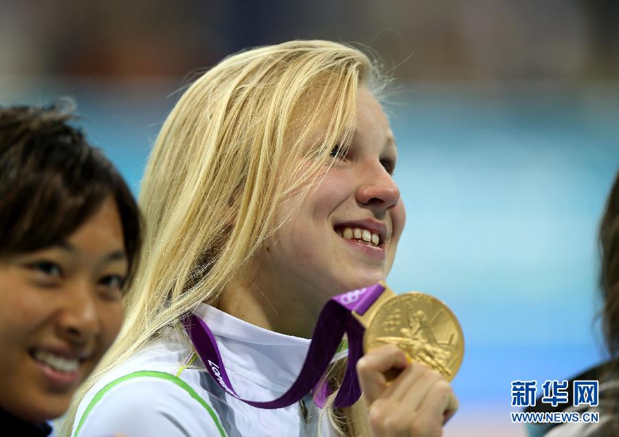 7月30日,梅卢提特在颁奖仪式上。当日,在伦敦奥运会游泳女子100米蛙泳决赛中,立陶宛选手梅卢提特以1分05秒47的成绩获得冠军。新华社记者费茂华摄
