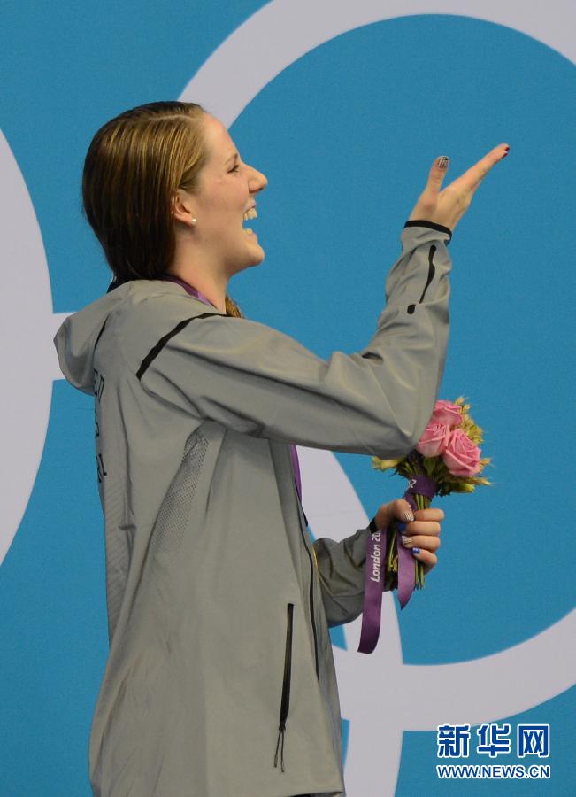 2012年8月3日,女子200米仰泳:富兰克林摘金刷新世界纪录。图为,富兰克林在颁奖仪式上庆祝。当日,在伦敦奥运会游泳女子200米仰泳赛中,美国选手富兰克林以2分04秒06的成绩夺冠,并创造新的世界纪录。新华社记者 杨磊 摄