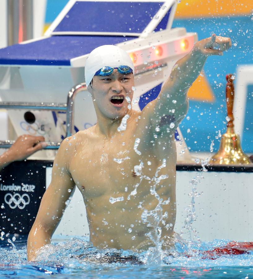 2012年8月4日,孙杨获得男子1500米自由泳冠军。图为,中国选手孙杨在获胜后庆祝。当日,在2012伦敦奥运会男子1500米自由泳决赛中,中国选手孙杨以14分31秒02的成绩获得冠军,并打破世界纪录。新华社记者 刘大伟 摄