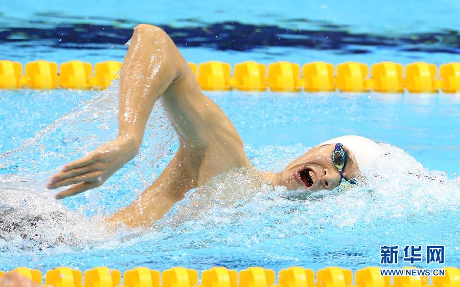 8月4日,中国选手孙杨在比赛中。当日,在2012伦敦奥运会男子1500米自由泳决赛中,中国选手孙杨以14分31秒02的成绩获得冠军,并打破世界纪录。新华社记者凡军摄