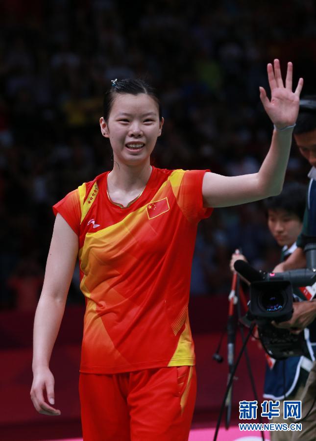 2012年8月4日,中国选手李雪芮获胜后庆祝。当日,在伦敦奥运会羽毛球女子单打决赛中,中国选手李雪芮以2比1击败队友王仪涵,夺得冠军。 新华社记者 任正来 摄