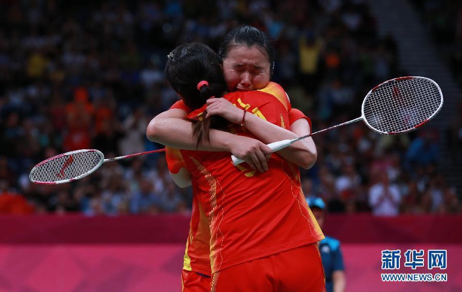 2012年8月4日,羽毛球女双:田卿/赵芸蕾夺得冠军。图为,田卿/赵芸蕾在庆祝获胜。当日,在伦敦奥运会羽毛球女子双打决赛中,中国选手田卿/赵芸蕾以2比0击败日本选手藤井瑞希/垣岩令佳,夺得冠军。 新华社记者 任正来 摄