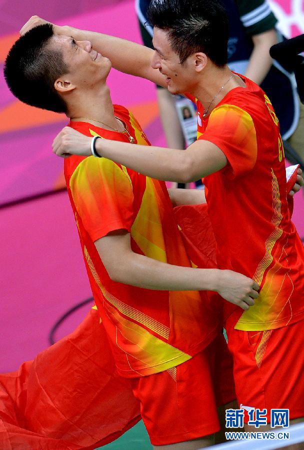 8月5日,蔡赟/傅海峰(左)在夺冠后庆祝。当日,在伦敦奥运会羽毛球男双决赛中,中国选手蔡赟/傅海峰以2比0战胜丹麦选手鲍伊/摩根森,获得冠军。新华社记者陈晓伟摄
