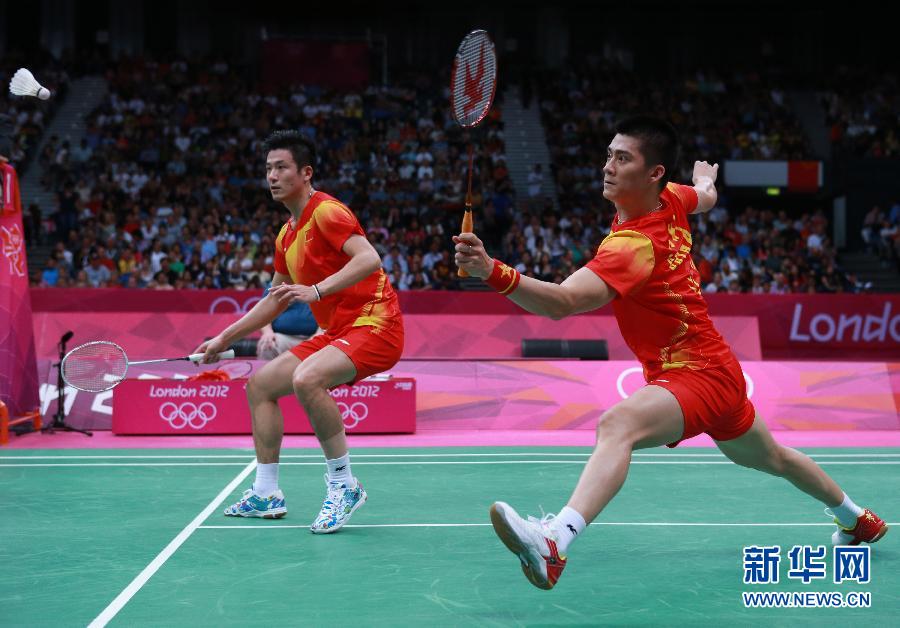 8月5日,蔡赟/傅海峰(右)在比赛中。当日,在伦敦奥运会羽毛球男双决赛中,中国选手蔡赟/傅海峰以2比0战胜丹麦选手鲍伊/摩根森,获得冠军。新华社记者任正来摄