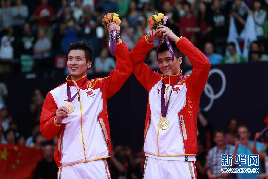 8月5日,蔡赟(左)/傅海峰在颁奖仪式上庆祝。当日,在伦敦奥运会羽毛球男双决赛中,中国选手蔡赟/傅海峰以2比0战胜丹麦选手鲍伊/摩根森,获得冠军。新华社记者任正来摄