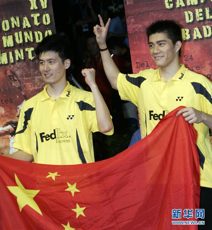 8月5日,在伦敦奥运会羽毛球男双决赛中,中国选手蔡赟/傅海峰以2比0战胜丹麦选手鲍伊/摩根森,获得冠军。图为2006年9月24日,中国选手蔡赟/傅海峰(右)在马德里进行的2006年世界羽毛球锦标赛男双决赛中,以2比0战胜英格兰选手克拉克/布莱尔,中国男双17年后重夺世锦赛冠军。新华社记者张晨摄
