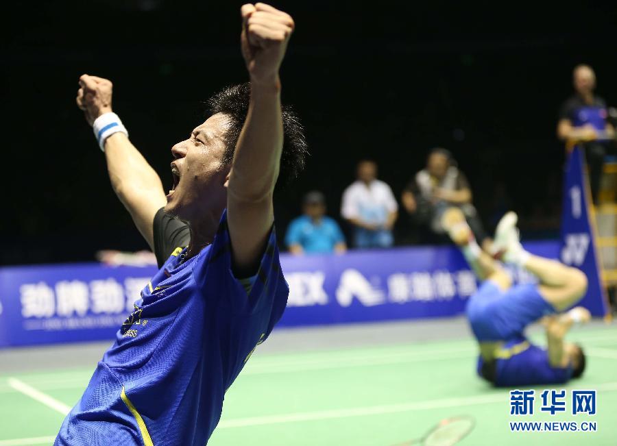 8月5日,在伦敦奥运会羽毛球男双决赛中,中国选手蔡赟/傅海峰以2比0战胜丹麦选手鲍伊/摩根森,获得冠军。图为2012年5月27日,中国队队员蔡赟庆祝胜利,他和搭档傅海峰在2012年汤姆斯杯羽毛球赛决赛中,以2比0战胜韩国队队员李龙大/金沙朗,帮助中国队以3比0战胜韩国队,夺得冠军。新华社记者孟永民摄