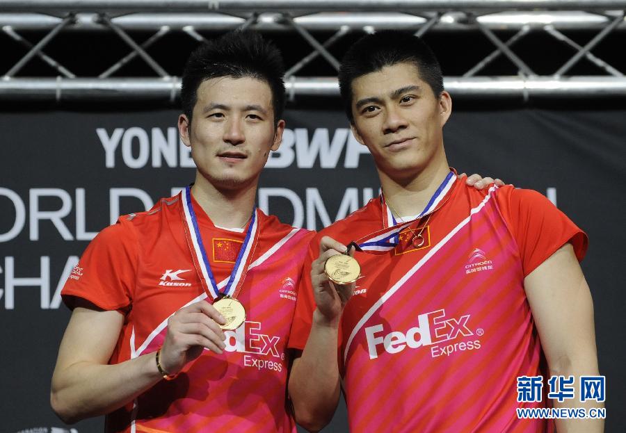8月5日,在伦敦奥运会羽毛球男双决赛中,中国选手蔡赟/傅海峰以2比0战胜丹麦选手鲍伊/摩根森,获得冠军。图为2011年8月14日,中国选手蔡赟/傅海峰(右)在英国伦敦举行的2011年羽毛球世界锦标赛男双决赛中,以2比0击败韩国组合高成炫/柳延星,第四次夺得世锦赛冠军。新华社记者曾毅摄