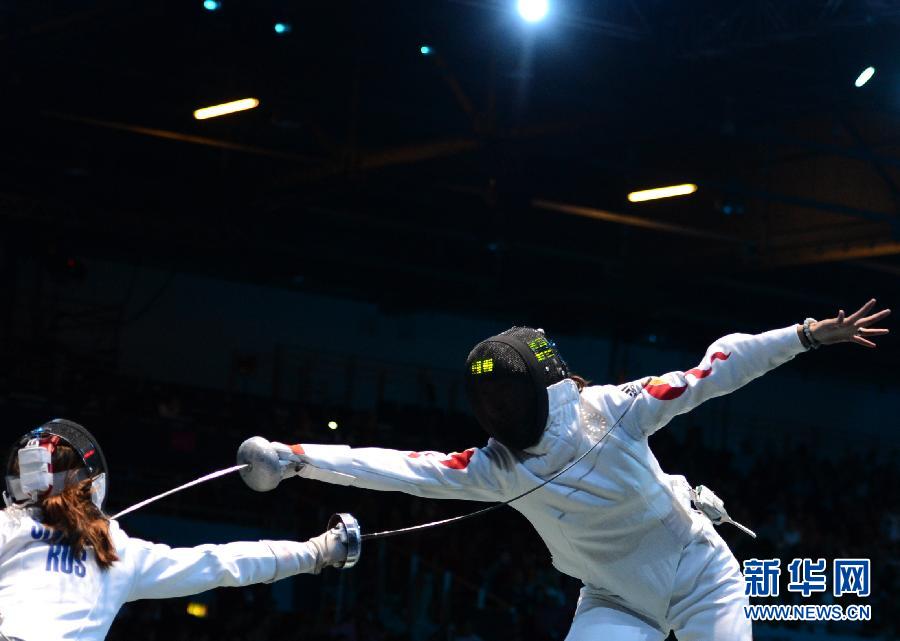 8月4日,中国队选手许安琪(右)对阵俄罗斯队选手斯芙科娃。当日,在伦敦奥运会击剑女子重剑团体半决赛中,中国队以20比19战胜俄罗斯队,进入决赛。 新华社记者 曾毅 摄