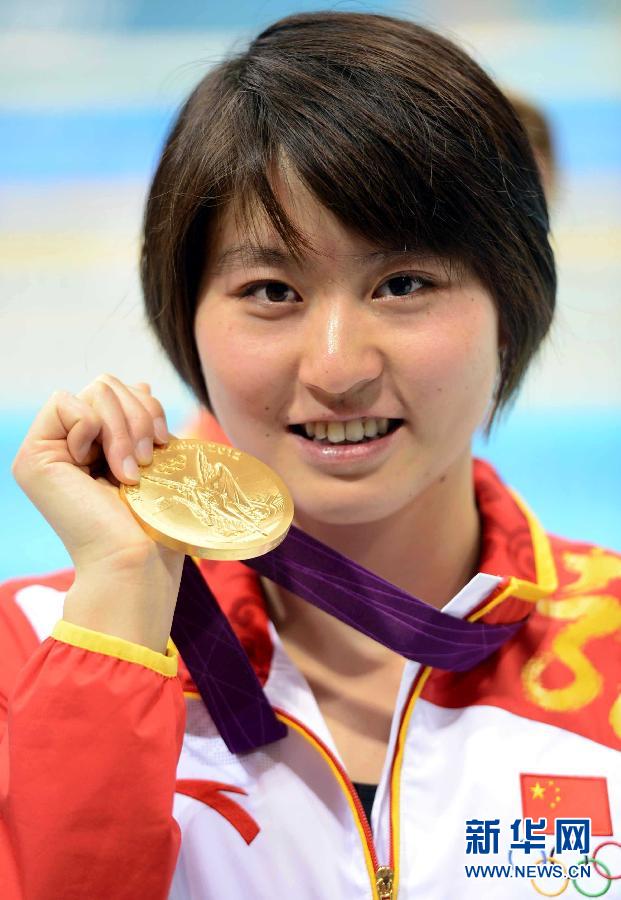 这是焦刘洋在伦敦奥运会女子200米蝶泳颁奖仪式上展示金牌(8月1日摄)。 新华社记者杨宗友摄