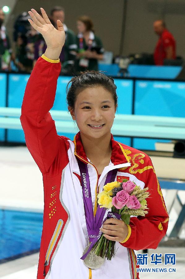 8月5日,中国选手何姿在颁奖仪式上。当日,在伦敦奥运会跳水女子3米板决赛中,中国选手何姿以379.20分的成绩获得亚军。新华社记者凡军摄