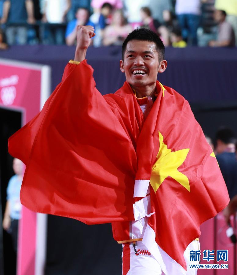 8月5日,林丹夺冠后身披国旗绕场庆祝。