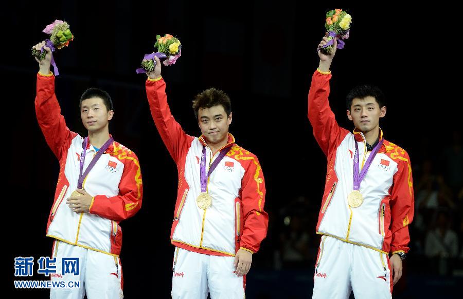 8月8日,中国队选手马龙、王皓、张继科(从左至右)在领奖台上。当日,在2012伦敦奥运会乒乓球男子团体赛决赛中,中国队以3比0的总比分战胜韩国队,夺得冠军。新华社记者王庆钦摄