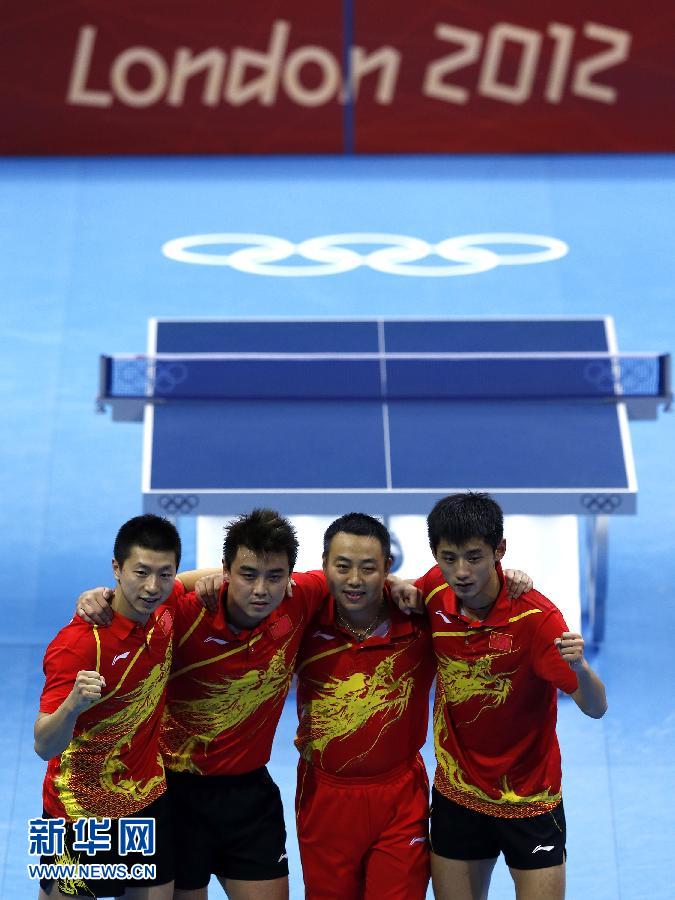 8月8日,中国队队员马龙(左一)、王皓(左二)、张继科(右一)与男队主教练刘国梁获胜后庆祝。当日,在伦敦奥运会乒乓球男子团体决赛中,中国队以3比0的总比分战胜韩国队,获得冠军。新华社记者沈伯韩摄