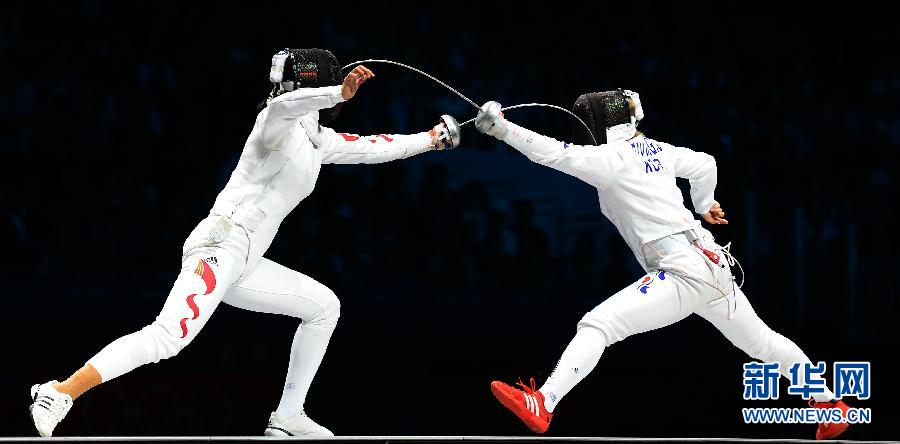 2012年8月4日,中国队选手李娜(左)对阵韩国选手。 当日,在伦敦奥运会击剑女子重剑团体决赛中,中国队以39比25战胜韩国队,夺得冠军。 新华社记者 吴晓凌 摄