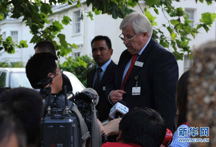 伦敦时间8月9日,刘翔在伦敦惠灵顿医院接受手术治疗,这家医院是伦敦最好的私立医院。为刘翔做手术的主刀大夫是尼古拉斯·卡伦,他是惠灵顿医院足踝外科的顾问级专家。手术做了1小时19分钟,据医生介绍手术非常成功,刘翔将留院观察两天之后回国。图为院方工作人员在与记者交谈。新华网 刘寰摄
