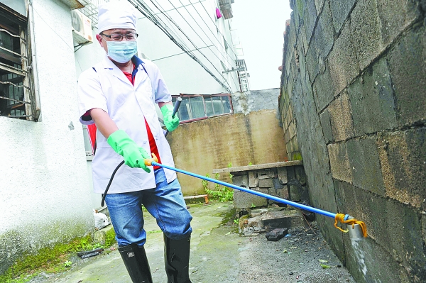 8月9日,兰江街道社区卫生服务中心的防疫人员正在下菱社区对遭遇水灾的低洼地段进行消毒杀菌。台风“海葵”过后,兰江街道社区卫生服务中心及时组织人员对辖区遭遇水灾的居民小区进行消毒杀菌,并向居民发放防疫知识宣传单。记者陈斌荣摄