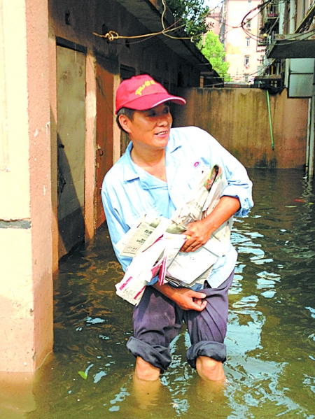 8月10日下午,宁波日报甬港发行站投递员时桂军蹚着齐膝深的积水,将当天的报纸挨户送到潜龙社区订户手中。