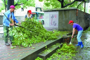 8月11日,江北区中马街道的社工志愿者们在清理辖区内被吹断的树枝、残叶。