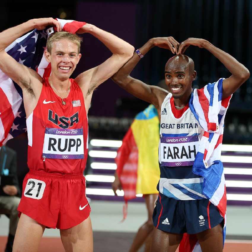 田径——男子万米:英国选手夺冠 8月4日,英国选手法拉(右)和美国选手鲁普在比赛后庆祝。当日,在伦敦奥运会田径男子万米比赛中,法拉以27分30秒42的成绩获得冠军。