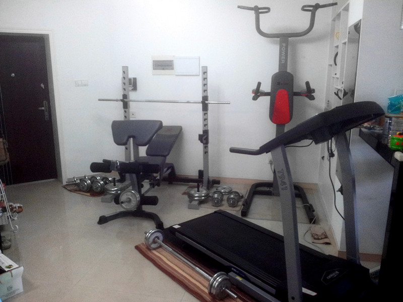 现在所有到我们家作客的朋友一定都会对我们家的客厅印象深刻。因为客厅的一部分被我打造成了一个功能齐备的健身房。如照片所示,一个可以承重300公斤的深蹲架,一个多功能哑铃凳,一个引体向上和双杠二合一的训练器,还有一台跑步机,地上和旁边的橱柜里一共有6对哑铃。从锻炼部位来看,全身每个部位都可以运动到;从运动方式来看,无氧和有氧运动都可以进行,我真是超爱我们家的客厅健身房!