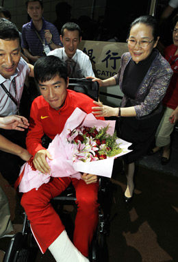 经过约20小时的飞行,刘翔并没有显得非常疲惫,与在伦敦办理登记不同,刘翔是坐着轮椅出来的,脚上依然绑着厚厚的绷带,并坐在轮椅上接受了媒体简单的采访,上海副市长赵雯等一行人前往机场接机。