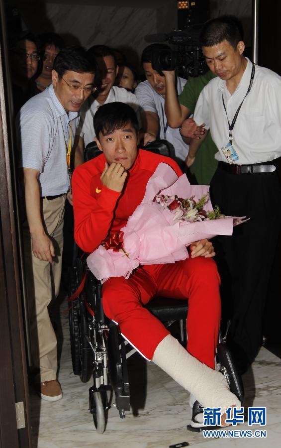 8月14日,刘翔(中)抵达机场。当日,中国田径运动员刘翔由伦敦飞抵上海浦东国际机场。 新华社记者任珑摄