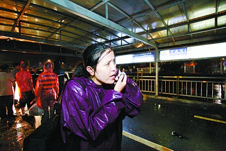 8月8日零时20分,一身雨水的马琴在火车东站帮助旅客联系志愿者车辆。