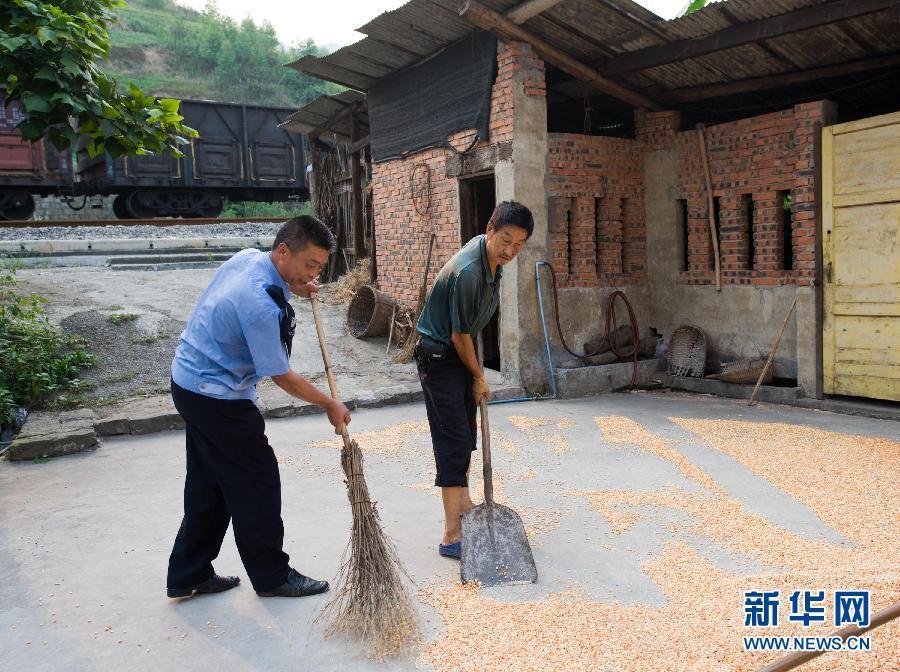 2012年8月12日 小站民警王基权 一个人的坚守换得千万人平安民警王基权帮助小岚垭四等火车站附近的村民干农活,同时进行铁路安全知识宣传(8月9日摄)。每年的8月,对小站民警王基权来说都是值得纪念的。因为在这段异常炎热的日子里,他从外面的世界走进了大山深处的四等小站--重庆小岚垭站,而且一干就是12年。巡线、沿铁路线宣传铁路安全知识、接送列车、检查三品、查车、重点货物防盗、检查异物,王基权这个10多年党龄的老党员每天的生活就围绕着这些看似很琐碎的事,一丝不苟地一遍又一遍重复着这些工作。在这个至今仍没有公路通至车站的四等小站,王基权的巡查工作主要靠步行,无论烈日还是阴雨,他每天至少要走24公里巡线,在小岚垭工作12年的4000多个日日夜夜,他已经走了超过10万公里,为此当地一些青年亲切地叫他“地球老王”,因为他走的路已经可以绕地球两圈半了。靠着腿勤和细心,王基权负责的全开放式路网(老式铁路,没有防护栏)12年来没有发生过路外人身安全事故和危及行车安全案件,是整个重庆铁路公安处辖区内线路治安管理最好的车站之一。在这个连电视信号都不好的山区小站,王基权这名基层党员靠着“为人民服务”的坚定信念,年复一年地坚守着平凡的岗位,用青春、汗水和一颗热切的心守护每一趟列车的行驶安全。如今,已经53岁的他仍然每天都巡查在铁路线上,他最大的愿望就是把自己警务区的安全纪录继续保持下去,为了这个平凡而伟大的目标,这位小站的普通民警将继续默默地坚守。新华社记者 刘潺 摄