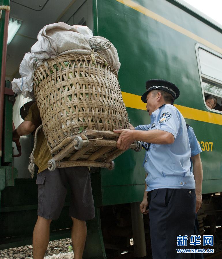 民警王基权在小岚垭四等火车站帮助背菜的当地村民安全登车(8月9日摄)。