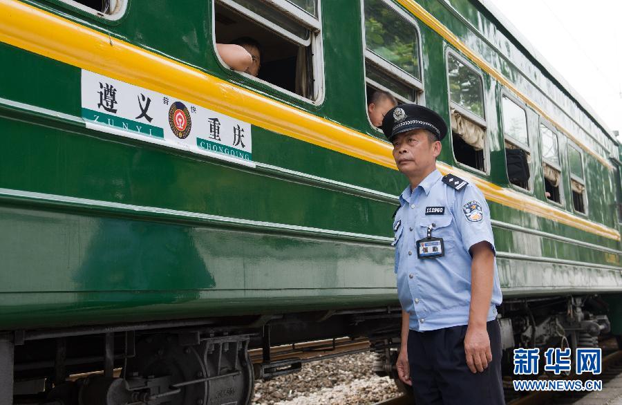 小岚垭四等火车站下午唯一一趟客运列车开行前,民警王基权在站台上进行安全巡查(8月9日摄)。