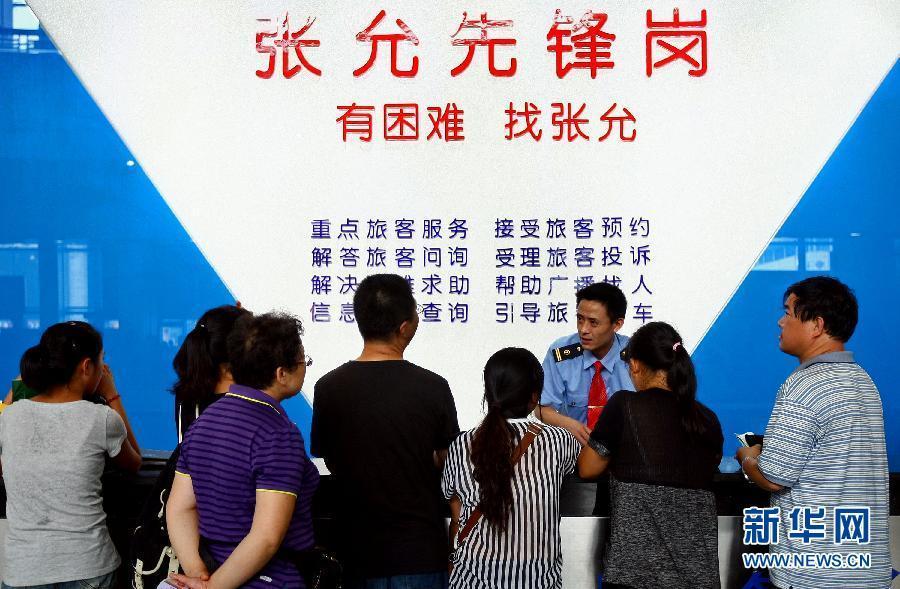 8月2日,张允在成都火车站服务旅客。今年37岁的共产党员张允是成都铁路局成都车站客运车间的工作人员。从事旅客服务工作以来,他坚持“有困难找张允”的服务理念,在工作中总结出巡视、观察、引导、帮扶等特色服务方法,热心为旅客服务。2011年10月,成都铁路局以他的名字命名,成立了一支由13名铁路人员组成的“张允先锋岗”,更好地服务旅客,受到旅客的好评。新华社发(薛玉斌摄)