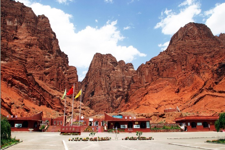 进入谷内,在红褐色的山峦中步行,仿佛进入了一个幽静清凉的世界。谷口十分开阔,但是深入谷中,峰回路转,时而宽阔,时而狭窄,有些地方仅一人侧身通过。谷底比较平坦,许多时候都能够闲庭信步,两侧是高耸的石壁,脚下是细沙,不少路段还覆着一层浅浅的水。抬头仰望,在蓝天的映照下,奇峰异石千姿百态,神犬守谷、旋天古堡、显灵洞、玉女泉、卧驼峰等景观个个形态逼真。