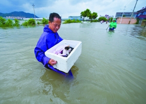 8月8日下午1点多,鄞州横溪镇一居民家进水,家里的小猫上窜下跳非常不安。老伯心痛小家伙,把它放在纸箱,涉水将它送往安全的地方。