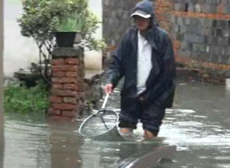 阳明社区太守房路昨天晚上开始积水,有位头戴鸭舌帽、身披雨衣老人从昨天晚上开始一直到今天下午,要么守在排水泵旁,要么在积水路段来回巡查,未曾合一下眼,他手里还拿着个网兜,不时地打捞水面上的漂浮物。