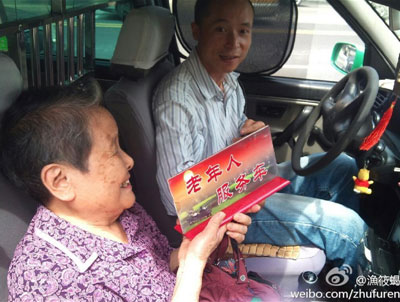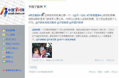 7月9日上午10点14分,宁波网友“漁筱蝎”发出微博:“今天,跟奶奶碰到了个好心的司机师傅。他的出租车是专门服务老年人的爱心车,70岁以上的老人坐他车免费。路上跟师傅聊了下,得知这完全是他的个人行为。”