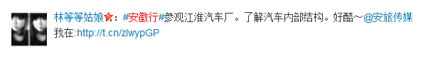 参观完冲压车间,网媒记者们又一起来到总装车间,一辆辆即将成品的江淮汽车整齐的排列在流水线上等待着装配工人的完善和检测,熟练的装配工人、先进高效的流水生产线以及颜色各异、即将下线的各类汽车,让网媒记者们开始三五成群地与汽车合影。来自每日甘肃网的记者在微博上说“车好了,请各位,提车吧!”,来自乐途旅游网的记者则表示,支持国货,支持自主品牌江淮。
