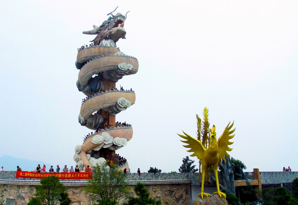 而在“龙飞凤舞”景点,一条盘旋而上的巨龙与一只金色的凤凰相依而立,巨龙的头部设有观光亭,是文博园的最高处,盘旋的龙身正是登顶的台阶。近百名网媒记者共同登上龙身,并集体合影留念。