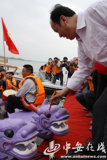 一点四十分,比赛即将开始前,安徽省龙河口水库管理处主任史志刚、舒城县委宣传部副部长孔凡长、万佛湖管委会主任秦继永、中安在线旅游网总监程浩等为参赛龙舟进行了点睛。