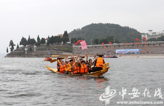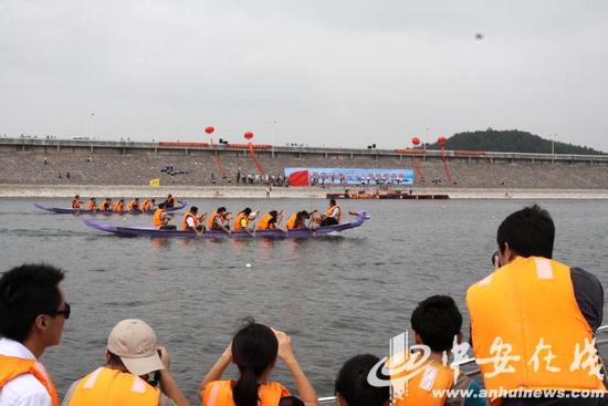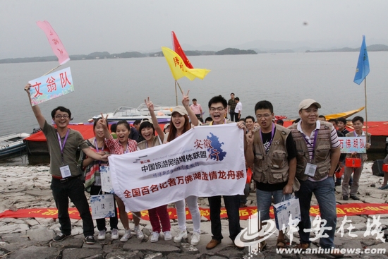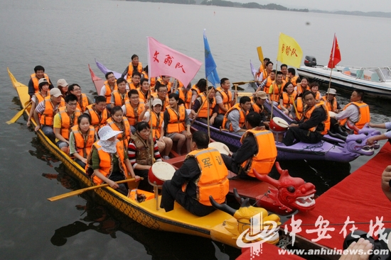 中午一点钟,万佛湖水库大坝前,四只由网媒记者代表组成的龙舟队——“周瑜队”、“文翁队”、“万佛湖队”、“万佛山队”依次排开,整装待发。记者看到,四条龙舟约有十二三米、状如蛟龙,龙舟色彩绚丽,分红、黄、青、白四色,队员们则以12人为一组,并分两排坐于龙舟中间,而水面上,浮漂已经拉好300米的赛道。