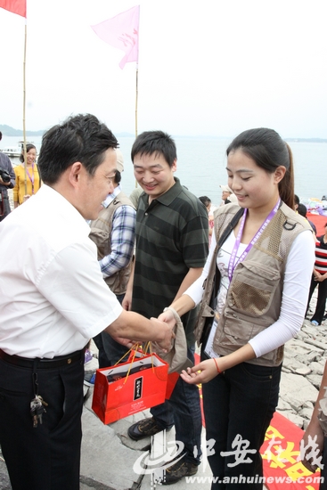 比赛结束后,舒城县委宣传部副部长孔凡长、舒城县旅游局局长汪宏、安旅传媒总经理张伟等为四只参赛队颁发了纪念礼品。最后,所有参赛队伍及网媒记者在大坝前合影留念,记录万佛湖激情龙舟赛美好之旅。