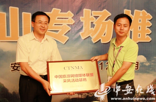 最后,此次“网媒安徽行”主办方中安在线旅游网总监程浩向齐云山旅游股份公司总经理裴世捷颁发了“中国旅游网络媒体联盟采风活动基地”奖牌。