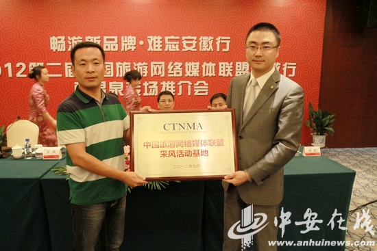 最后,此次“网媒安徽行”承办方之一安旅传媒总经理向醉温泉度假城总经理金晨颁发了“中国旅游网络媒体联盟采风活动基地”奖牌。