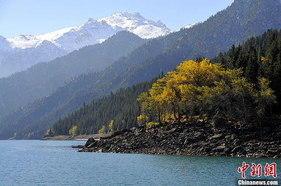 近日,新疆天山天池迎来一场降雪,温度下降,让许多到此观光的游客,穿上了羽绒服,但雪后的天池阳光灿烂、白雪覆盖高山、高山包围天池,让人陶醉其中。据了解,新疆天池是世界著名高山湖泊,位于新疆阜康市南偏东40余公里,古称“瑶池”,地处天山博格达峰北侧,海拔1910米,湖水最深处达105米,旺水时面积4.9平方公里,湖泊被高山、森林、河流、瀑布、寺庙、怪石等景观包围。图为湖边秋意正浓的森林。马新龙 摄