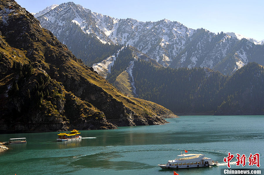 近日,新疆天山天池迎来一场降雪,温度下降,让许多到此观光的游客,穿上了羽绒服,但雪后的天池阳光灿烂、白雪覆盖高山、高山包围天池,让人陶醉其中。据了解,新疆天池是世界著名高山湖泊,位于新疆阜康市南偏东40余公里,古称“瑶池”,地处天山博格达峰北侧,海拔1910米,湖水最深处达105米,旺水时面积4.9平方公里,湖泊被高山、森林、河流、瀑布、寺庙、怪石等景观包围。图为游艇在湖面“画了一个圈”。马新龙 摄
