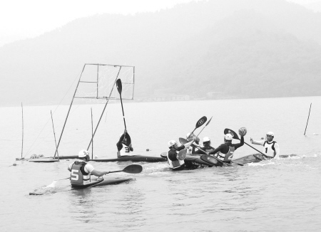 为了给本次皮划艇文化节助兴,组委会特别邀请了来自台湾的专业皮艇球队前来助阵。皮艇球俗称水球艇,两队各有5名队员,他们各乘水球艇在水上用手或桨互相传递球,并射向对方球门,以进球多少来定胜负。10月6日下午1点,皮艇球对抗赛在东钱湖湖面开始,有进攻、有防守、有对抗、有技巧,眼花缭乱的比赛扣人心弦。围观的观众不停地欢呼:“船好像长在身上一样,从来没有见到过这种比赛,真刺激!”