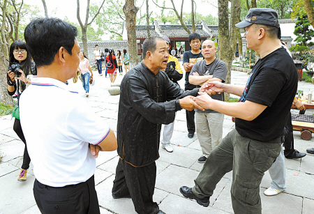 14日下午,山东枣庄太极大师牛传扬等一行应邀与宁波太极拳爱好者在保国寺交流练习太极拳的心得体会。(记者 李岩宏 摄)
