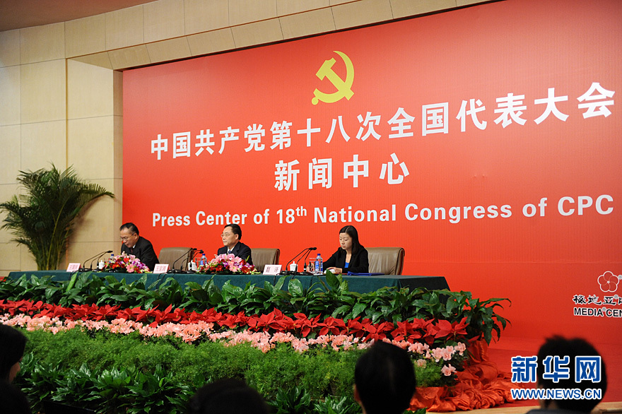 2012年11月9日,十八大新闻中心举行记者招待会,请中共中央组织部副部长王京清介绍党的建设工作,并回答记者提问。图为记者会现场。新华网 陈竞超 摄