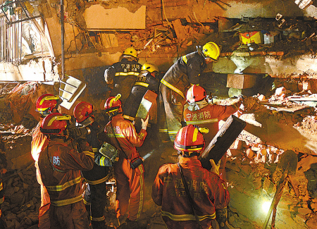 昨晚抢险搜救人员在石层之间用木头撑住,以防再次坍塌